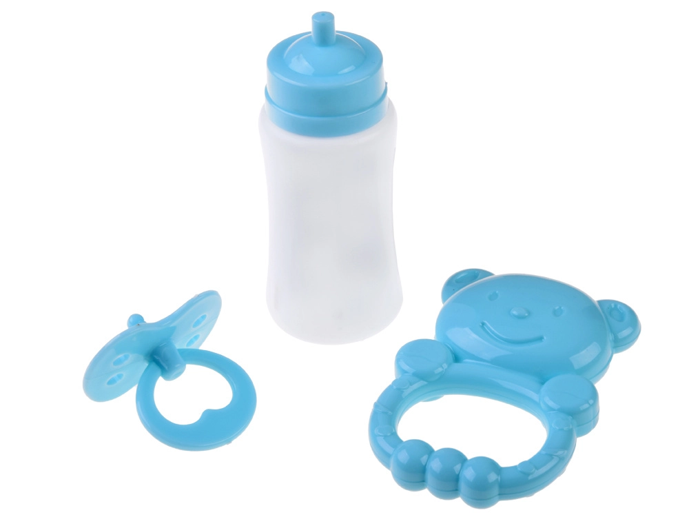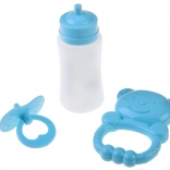 Enthalten sind Flasche, Schnuller und eine Bärenrassel. Das Zubehör ist leicht, gut greifbar und passt perfekt zum Outfit.