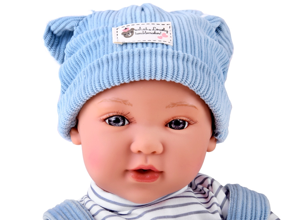Die interaktive Babypuppe besticht durch realistische Gesichtszüge, lange Wimpern und ausdrucksstarke Augen. Sie hat einen weichen Körper zum Kuscheln sowie einen Kunststoffkopf und -gliedmaßen für Robustheit beim täglichen Spiel. Das stilvolle Outfit aus blauem Cord harmoniert wunderbar mit dem gestreiften T-Shirt und der Strickmütze.