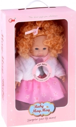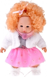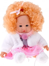 Inklusive Winter-Outfit: rosa-graues Kleidchen mit Sternchen, kuschelige weiße Jacke, rosa Schal mit Bommel und weiche Hausschuhe. Das integrierte Soundmodul spielt verschiedene kindliche Laute ab, wodurch das Spiel noch interaktiver und realistischer wird.