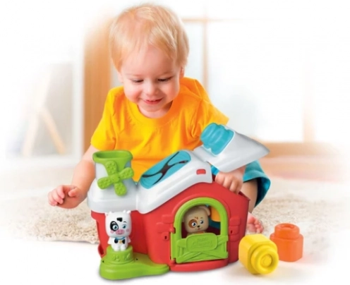 Dieser interaktive Bauernhof aus der Clemmy-Reihe bietet sicheres und anregendes Spiel für Kleinkinder. Im Inneren befinden sich viele weiche, leicht greifbare Bausteine, die durch die Fenster oder über das Dach eingeworfen werden können. Ein Dachteil hat eine weiche Einlage zum Einstecken, der andere Teil lässt sich öffnen für ein einfaches Entnehmen der Steine.