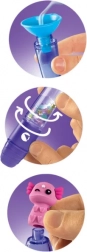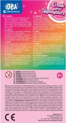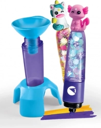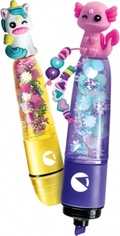 Enthalten sind mehrere farbige Tinten, leere Textmarkerkörper, kleine Verzierungen sowie Werkzeuge für die Montage. Kinder wählen die Farbe, befüllen den Stift, dekorieren ihn mit Figuren magischer Tiere und erhalten so ein originelles Schulaccessoire.