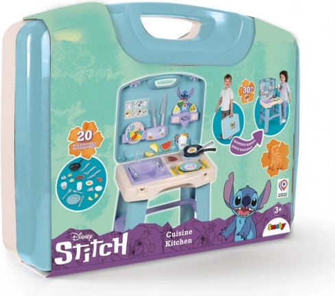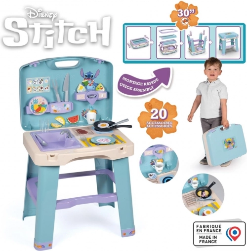 Diese Kinderküche verwandelt sich in wenigen einfachen Schritten vom Koffer in ein vollwertiges Küchenstudio – einfach ausklappen, die Füße montieren und das Kochen kann beginnen. Das fröhliche DISNEY STITCH Motiv fördert die Fantasie und das Rollenspiel – für viele Stunden Spielspaß.