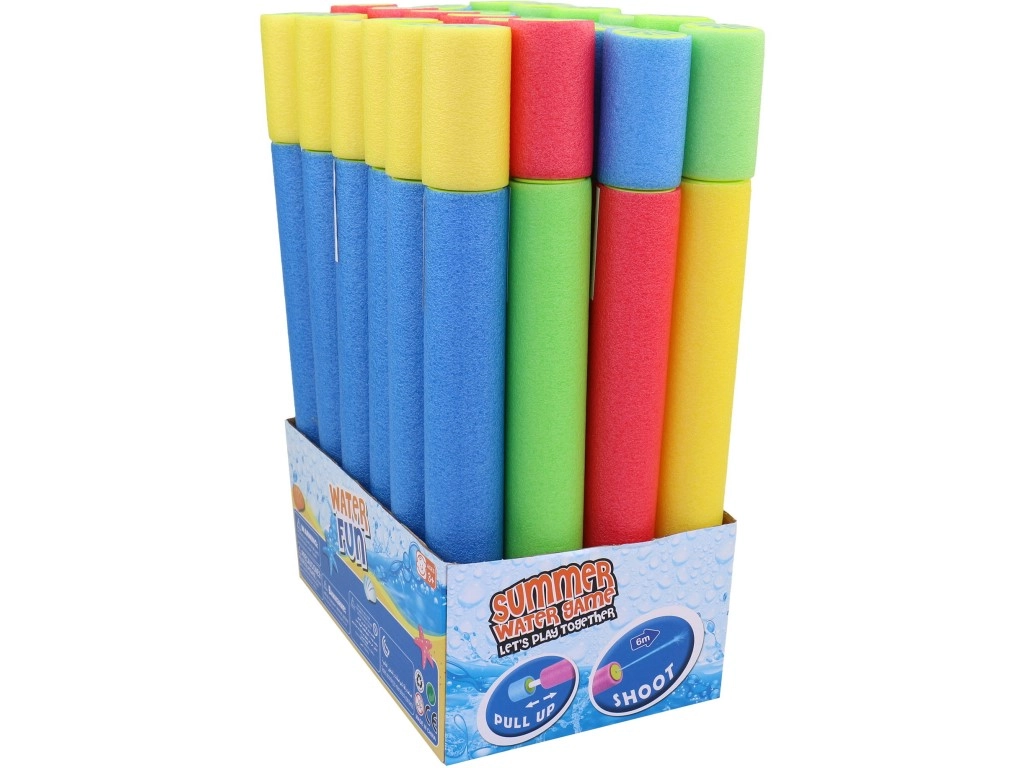 Die Displaybox enthält 24 Stück in drei Farbvarianten – ideal für größere Gruppen, Poolpartys oder zur Ergänzung des saisonalen Sortiments. Der einfache Kolbenmechanismus sorgt für schnelles Ansaugen und Verspritzen von Wasser – einfach eintauchen, aufziehen und spritzen.
