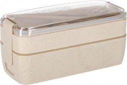 - Untere Schale, obere Schale, Zwischen-deckel/Trennwand zwischen den Ebenen, verschiebbare Trennwand, Deckel mit Silikondichtung und zwei Clips, 1× Gabel, 1× Löffel