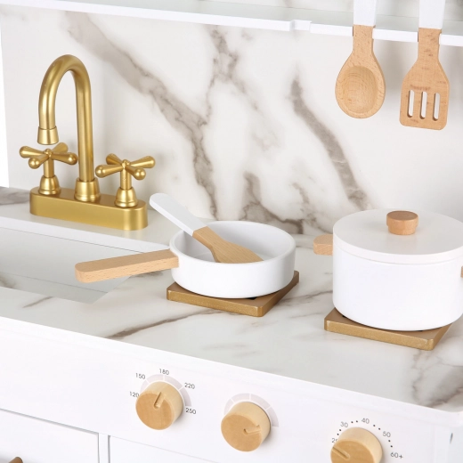 Diese moderne Holzküche bietet Kindern ein authentisches Kocherlebnis in sicherer und ästhetischer Ausführung. Die marmorierte Optik der Arbeitsplatte und des Hintergrunds verleiht der Küche ein premium Design, das perfekt in Kinderzimmer und Wohnzimmer passt. Kinder können kochen, rühren, backen und Geschirr spülen und so die Erwachsenen im Haushalt nachahmen.