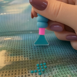 Das gerillte Tablett, der Applikator und das Wachs sorgen für präzises Aufnehmen und Platzieren der Steinchen an die richtigen Stellen gemäß den Symbolen auf der Leinwand.