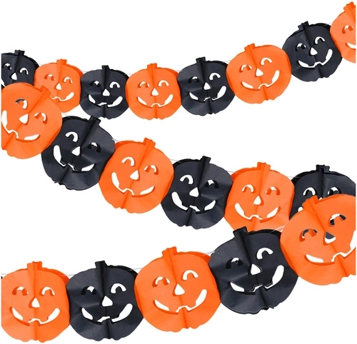 Schaffen Sie im Handumdrehen eine stimmungsvolle Herbst- und Halloween-Atmosphäre. Die RUHHY-Papiergirlande mit Kürbismotiv eignet sich perfekt zum Aufhängen an der Wand, im Fenster, über dem Tisch oder am Eingang. Dank der leichten Konstruktion lässt sie sich mühelos befestigen und bietet gleichzeitig eine starke visuelle Wirkung.