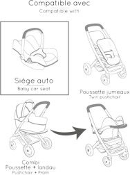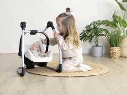 Dieses multifunktionale Puppenset kombiniert drei beliebte Funktionen in einem: einen Autositz für einfaches Tragen, einen Schaukelsitz bei Aufhängung am Gestell und einen stabilen hohen Hochstuhl nach dessen Drehung. Ideal für realistisches Spiel und die Förderung der kindlichen Fantasie.