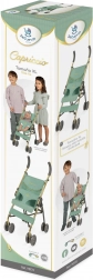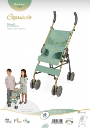 Der elegante Puppenbuggy im Golf-Style besticht durch raffinierte Textilverarbeitung in Kombination aus Strickoptik und glattem Stoff. Der dunkelgraue Rahmen mit goldenen Details und der Stickerei CAPRICCIO unterstreicht den Premium-Look. Die Griffhöhe von 75 cm ist perfekt für Kindergartenkinder.