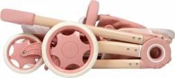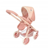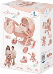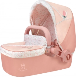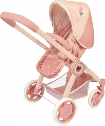 Praktische Details bereichern das tägliche Spiel: schwenkbare Vorderräder für eine sanfte Fahrt, Aufbewahrungskorb für Kleinigkeiten, Tasche am Verdeck mit Stofftulpe und Glöckchen sowie eine dekorative Wannenabdeckung mit Klettverschlüssen und Täschchen. Der Wagen ist klappbar, nimmt daher wenig Platz ein und lässt sich leicht im Auto transportieren.