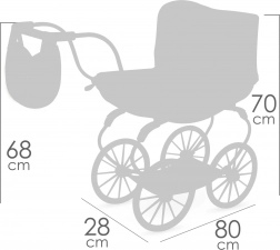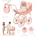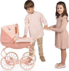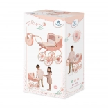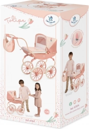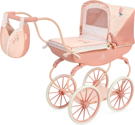 Der tiefe Puppenwagen aus der Kollektion Tulipe 2025 überzeugt durch präzise Verarbeitung und eine schöne Kombination aus helleren und dunkleren lachsfarbenen Pastelltönen mit zartem Blumenmuster. Dank der Federn zum Schaukeln und der weichen Matratze genießt die Puppe ein bequemes „Schläfchen“, während die klappbare Haube und die Abdeckung der Wanne sie bei Spaziergängen schützen.