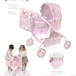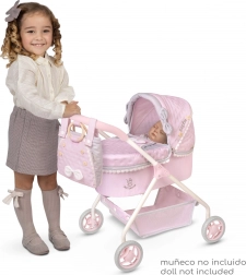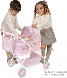 Die praktische Ausstattung umfasst eine abnehmbare Tasche für den Wagen oder zum Tragen in der Hand, eine Wannenabdeckung mit Ösen und kleinen Taschen, eine bequeme Matratze sowie unteren Stauraum für Kleinigkeiten. Spanisches Design und präzise Verarbeitung sorgen für lange Lebensdauer und täglichen Spielspaß.
