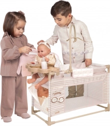 Enthalten ist alles, was kleine Puppeneltern brauchen: ein Mobile zur Unterhaltung der Puppe, ein Wickeltisch für die Pflege, ein Hochstuhl mit Fläschchen, Schüssel und Besteck sowie ein praktischer Kleiderschrank mit Reißverschluss und Kleiderbügeln. Der Liegebereich mit Netzfenster ermöglicht es Kindern, die Puppe stets im Blick zu behalten, und die großzügige Basis sorgt für Komfort beim Spielen.