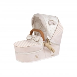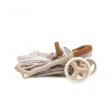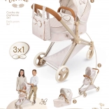 Die dezente Kombination aus Hellbeige und Weiß mit feinen Mustern, Schleifchen und gestickten Bienchen verleiht dem VERONA-Wagen einen zeitlosen Look, inspiriert von modernen Kinderwagen. Dank der Griffhöhe von 73 cm und der Kombination aus Wanne und Sportsitz ist er ideal für Vorschulkinder, die realistische Details und leichte Handhabung schätzen.