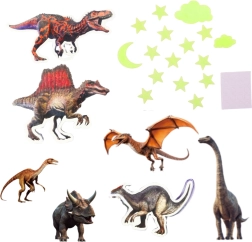 Schaffen Sie ein prähistorisches Abenteuer direkt an der Wand. Die fluoreszierenden Deko-Elemente mit Dinosauriern und Nachthimmel leuchten nach kurzer Aufladung in einem sanften Licht und sorgen für eine beruhigende Atmosphäre. Die Montage ist kinderleicht – selbstklebende Schaumstoffelemente haften zuverlässig an Wänden, Decke und Möbeln und lassen sich spurlos wieder entfernen.
