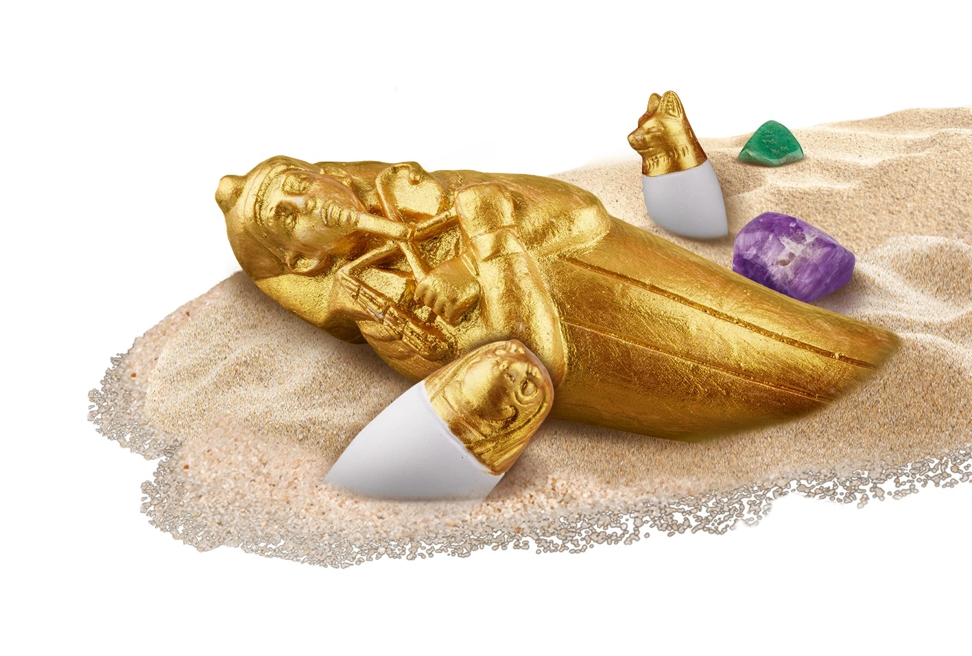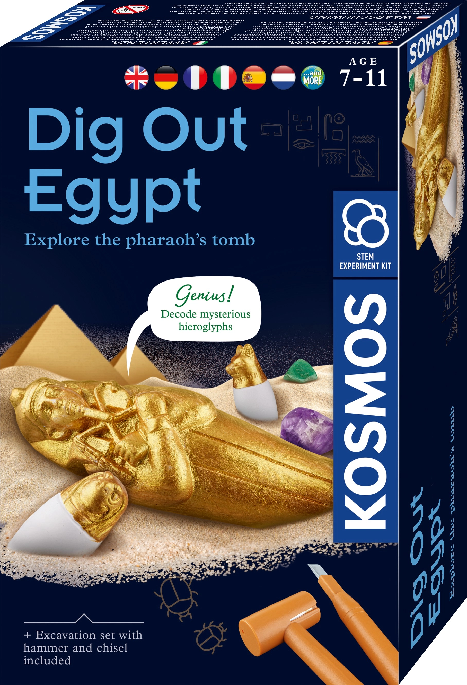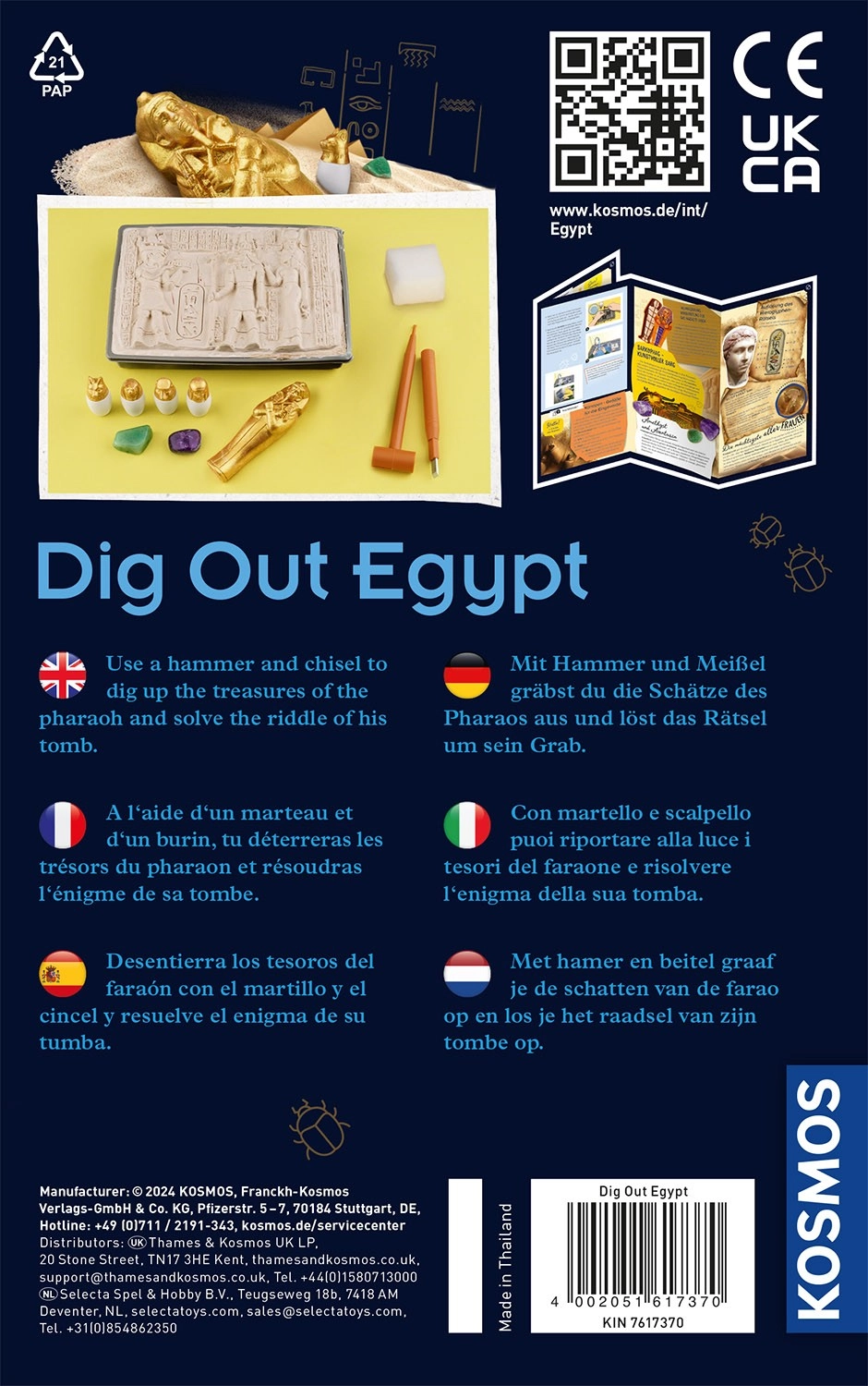 Mit dem Archäologie-Set Kosmos Ägyptische Ausgrabungen werden Ihre Kinder zu kleinen Archäologen. Mit Meißel und Hammer legen sie Schritt für Schritt die im Gips verborgenen Schätze frei und lernen dabei viel Spannendes über das Alte Ägypten. Die praktische, bebilderte Anleitung ist auf Englisch verfügbar und liegt mit deutscher Übersetzung bei; außerdem können Sie die deutsche Anleitung bequem per QR-Code herunterladen.
