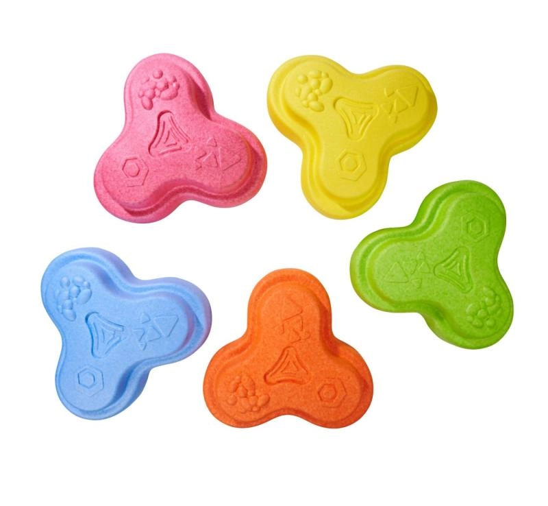 Gefertigt aus EPP (expandiertem Polypropylen) sind die Steine extrem leicht, zugleich strapazierfähig und im Vergleich zu herkömmlichen Kunststoffspielzeugen angenehm warm im Griff. Sie lassen sich leicht reinigen, sind speichel- und schweißbeständig und funktionieren sowohl drinnen als auch draußen hervorragend.