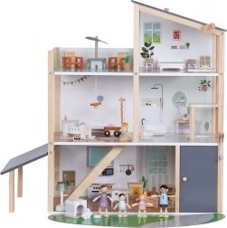 Das Puppenhaus bietet mehrere Stockwerke mit Küche, Wohnzimmer, Bad, Schlafzimmer und Kinderzimmer. Offene Fronten und Seiten sorgen für einen einfachen Zugang zum bequemen Spielen und Arrangieren der Möbel.