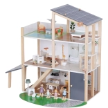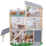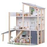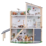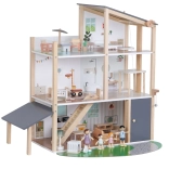 Dieses moderne Holzpuppenhaus bietet alles, was Kinder lieben: eine mit dem Wohnzimmer verbundene Küche, ein stilvolles Badezimmer mit Badewanne, ein Kinderzimmer, ein Schlafzimmer und eine geräumige Dachterrasse. Das verspielte Design, sanfte Farben und die hochwertige Verarbeitung machen das Haus zu einer schönen Ergänzung für Kinderzimmer und Spielräume.