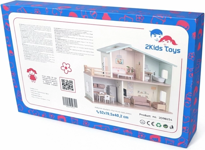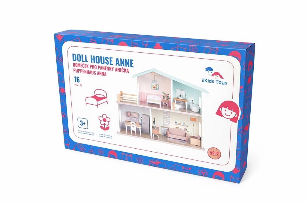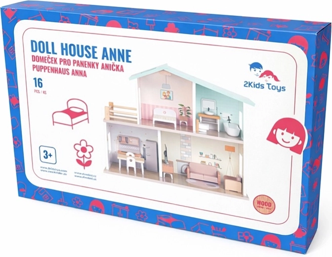 Entdecken Sie das schöne Holzpuppenhaus Anička von 2Kids Toys mit zwei Etagen, Balkon und vollständig ausgestatteten Räumen. Dank der 16 Möbel- und Zubehörteile genießen Kinder stundenlange kreative Rollenspiele, fördern ihre Fantasie und sozialen Fähigkeiten. Die hochwertige Holzausführung, sanfte Farben und die stabile Konstruktion machen es zu einem bezaubernden Blickfang im Kinderzimmer. Eine Montageanleitung ist enthalten; das Haus wird zerlegt geliefert. Geeignet ab 3 Jahren.