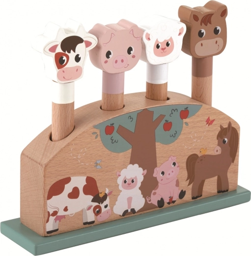 Dieses hölzerne Pop-up-Spiel sorgt für viel Lachen und Überraschung – Kuh, Schwein, Schaf und Pferd springen fröhlich heraus, sobald die Feder gedrückt wird. Dank hochwertigem Naturholz und erdigen Farbtönen passt das Spielzeug wunderbar in jedes Kinderzimmer.