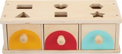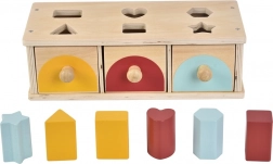 Die obere Platte mit Aussparungen führt das Kind zu präzisem Einsetzen, während drei Schubladen mit Griffen das einfache Entnehmen der Teile und wiederholtes Spielen ermöglichen. Die robuste Ausführung sorgt für Langlebigkeit und sicheres Spielen bereits ab 1 Jahr.