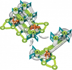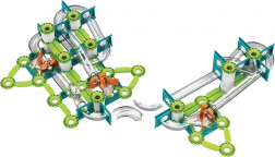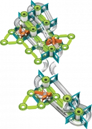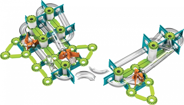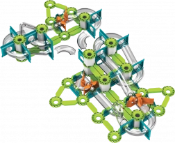 Grüne Schienen, Träger und orangefarbene Auslöser lassen sich leicht zu stabilen Strecken verbinden. Interaktive Elemente führen die Kugeln durch Kurven und Gefälle.