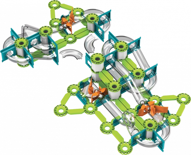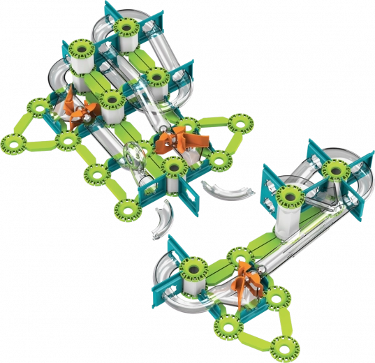 Bauen Sie bis zu 11 verschiedene Rundkurse und Schleifen, in denen die Kugeln durch die Schwerkraft angetrieben werden. Testen Sie schnelle Abfahrten, Kurven und Loopings.