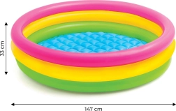 Der aufblasbare Kinderpool mit einem Durchmesser von 147 cm und einer Höhe von 33 cm ist die ideale Wahl für heiße Sommertage. Intensive Farben in Pink, Gelb und Grün ziehen jedes Kind an und verwandeln jeden Raum in ein kleines Wasserparadies.
