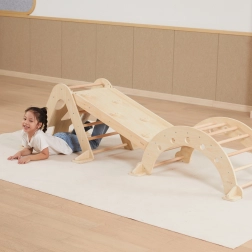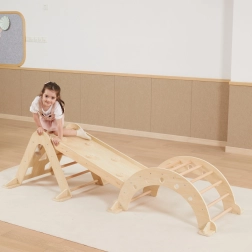 Die Platte ist mit Zubehör (Wippe/Rocker und Kletterdreieck) kompatibel, sodass ein modulares Set für Heimtraining und aktives Spiel entsteht. Geeignet ab 18 Monaten, fördert Selbstständigkeit, Bewegungssicherheit und die Freude an natürlicher Aktivität – inspiriert von Montessori-Prinzipien.