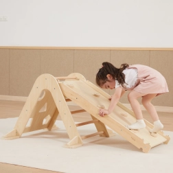 Eine Seite für sanftes Rutschen und Balancieren, die andere mit Griffen als motivierende Kletterwand für tägliche Bewegung.