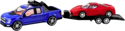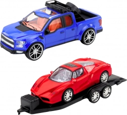 Dieses vielseitige Set kombiniert einen blauen Pickup mit zweiachsigem Anhänger und einen eleganten roten Sportwagen. Kinder können das Fahrzeug mit Hilfe der Rampe aufladen, transportieren und abladen, Rennszenarien erschaffen und Fantasie, Feinmotorik sowie Koordination fördern.