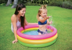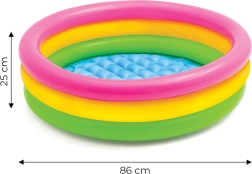 Der aufblasbare Pool von INTEX bringt Kindern Wasserspaß direkt in Ihren Garten. Dank der kompakten Abmessungen 86 × 25 cm passt er fast überall hin, und der niedrige Wasserstand von 17 cm erhöht das Sicherheitsgefühl für die Kleinsten. Das bunte Regenbogendesign ist auffällig und lädt zum Spielen ein.