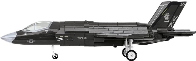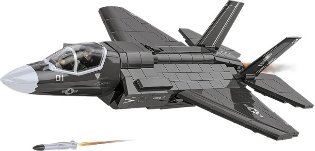 Bausteinset F‑35B Lightning II 1:48, 614 Teile. Öffnendes Cockpit, bewegliche Elemente, Gummiräder, Pilotenfigur, Ständer und offizielle Lockheed Martin Lizenz.