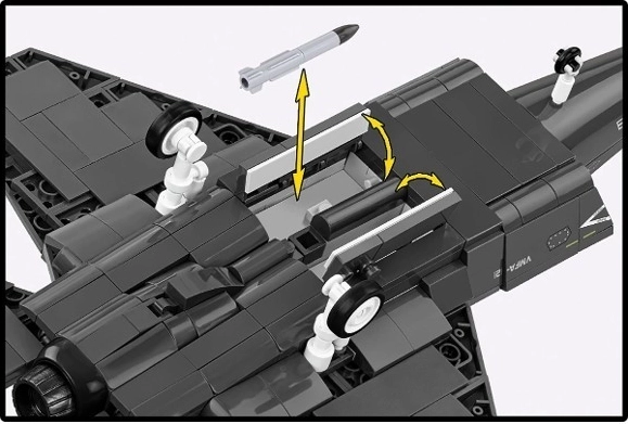 Das Set umfasst 614 präzise gefertigte Teile mit widerstandsfähigen Drucken, sodass der Look langfristig erhalten bleibt. Freuen Sie sich auf eine zu öffnende Cockpithaube, verstellbare Steuerflächen, Gummiräder und den Bombenschacht. Ebenfalls dabei: ein Präsentationsständer und eine Pilotenfigur in US-Fliegerausrüstung.