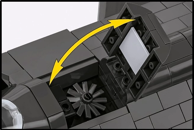 Öffnendes Cockpit, bewegliche Steuerungselemente, öffnender Bombenschacht, rollende Gummiräder