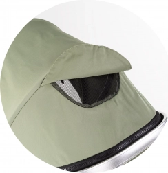 Verstellbares Verdeck mit Sonnenschutz und Sichtfenster, höhenverstellbarer Griff aus Eco-Leder, großer Korb, Fußsack und Sicherheitsschlaufe am Schiebegriff.