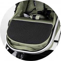 Die Rückenlehne ist in 3 Positionen verstellbar, das verstellbare Verdeck mit abnehmbarer Sonnenblende und Sichtfenster sowie der gepolsterte Fußsack bieten dem Kind maximalen Komfort bei jedem Wetter. Zur Sicherheitsausstattung gehören ein 5-Punkt-Gurt mit weichen Polstern, ein abnehmbarer Bügel mit Eco-Leder-Bezug, eine gekoppelte Hinterradbremse und eine Sicherheitsschlaufe am Griff. Ein großer Korb und die Wickeltasche erleichtern den Alltag.