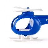 Der blaue Polizeihubschrauber mit drehenden Rotoren landet auf dem Garagendach – ideal für spannende Geschichten und actionreiche Einsätze.