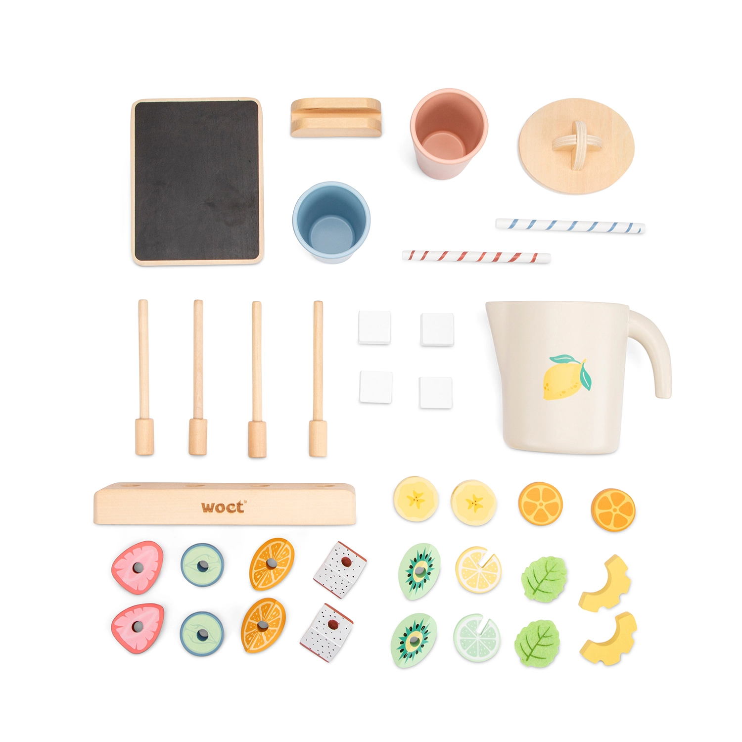Der Lieferumfang besticht durch liebevolle Details: zwei Becher mit Strohhalmen, ein Krug mit Deckel, eine Tafel mit Schild für das Tagesangebot, vier Spieße mit Ständer sowie viele hölzerne Obstscheiben. Das Material ist hochwertig und angenehm anzufassen, mit Fokus auf Sicherheit und Umweltfreundlichkeit.