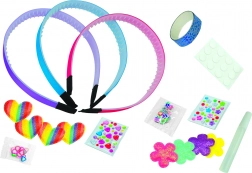 Dieses Kreativset zur Herstellung von Haarreifen ist die ideale Wahl für kleine Designerinnen und geschickte Hände. Dank der umfangreichen Ausstattung gestalten Kinder ganz einfach stylische und farbenfrohe Haarreifen genau nach ihrer Fantasie. Selbstklebende Elemente und der beiliegende Kleber sorgen für einfaches und sauberes Basteln ohne Unordnung.
