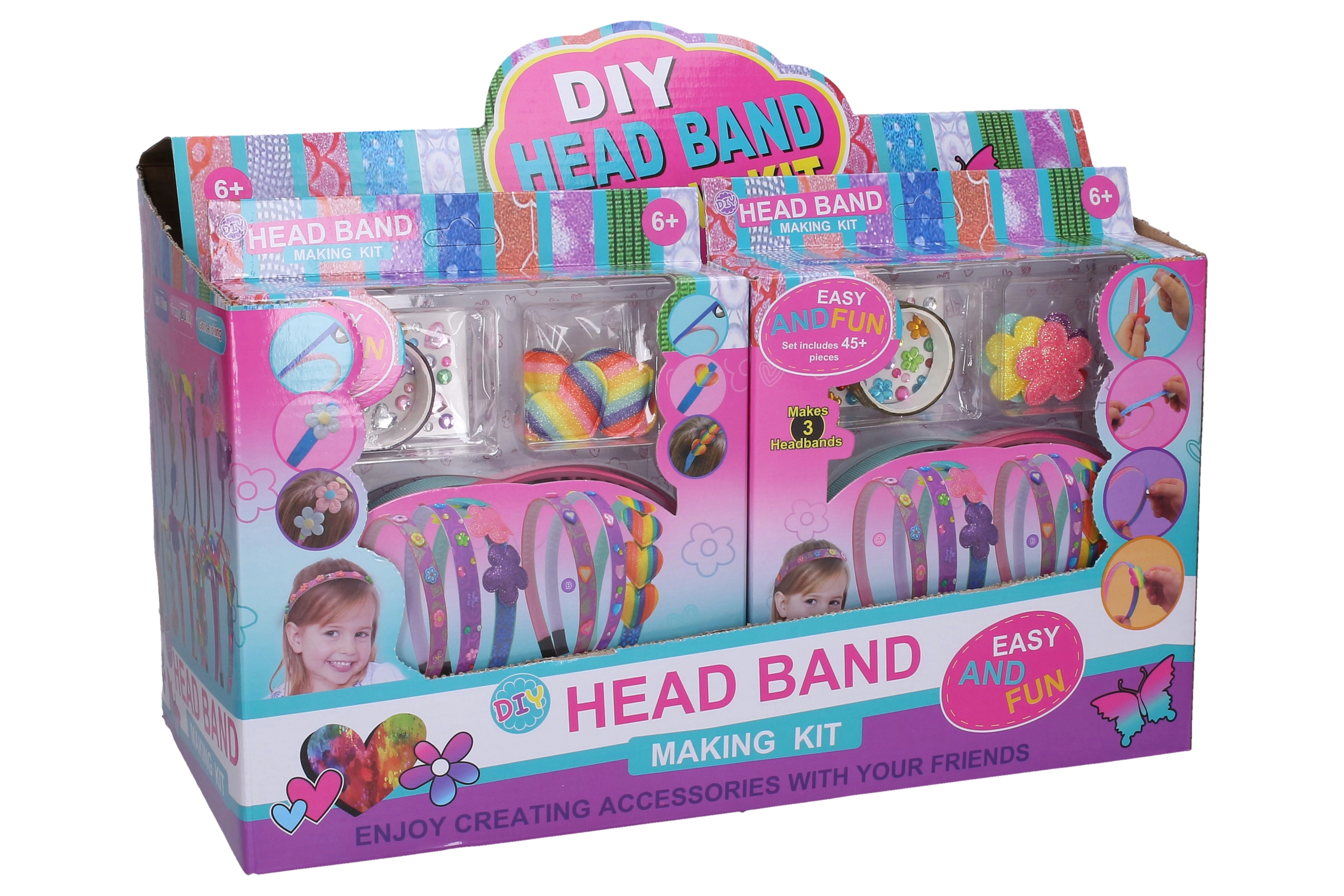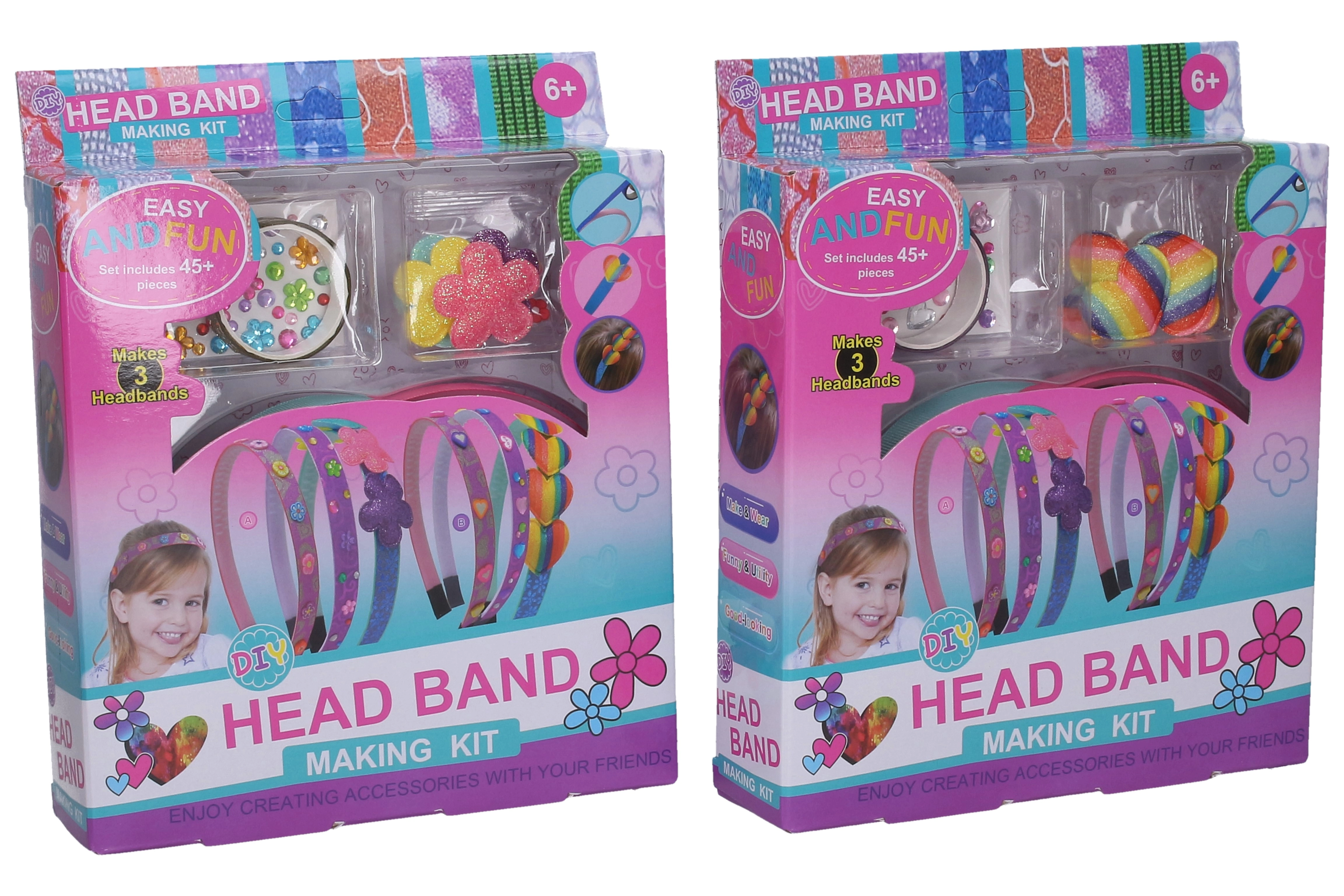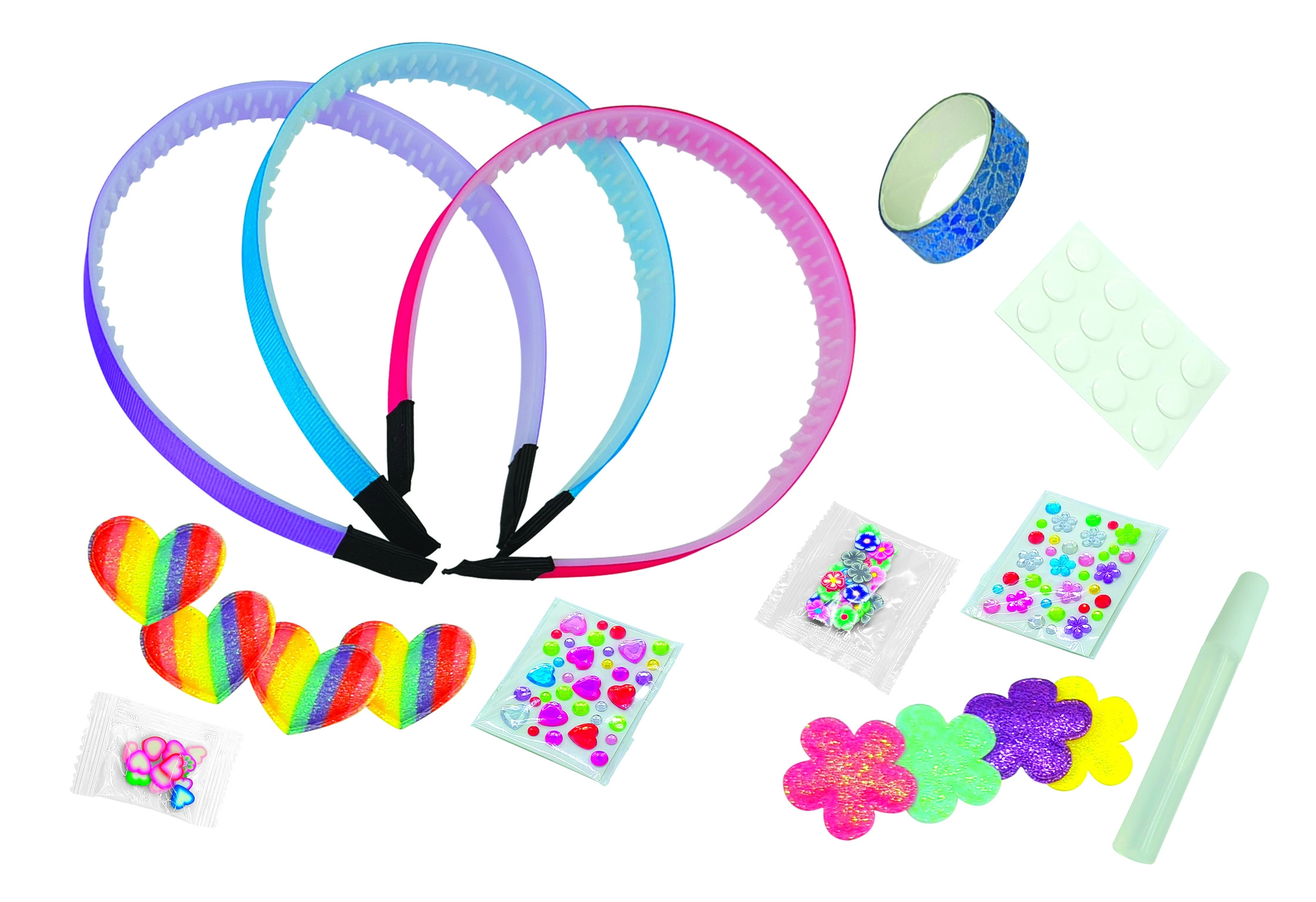 Im Set finden Sie alles, was Sie zur Herstellung von 3 Haarreifen benötigen – von den grundlegenden Kunststoff-Haarreifen bis hin zu Deko, selbstklebenden Punkten, Bändern und glitzernden Verzierungen. Das Set ist für Kinder ab 6 Jahren geeignet und bietet eine schnelle, spaßige und kreative Aktivität für zu Hause oder Kinderpartys.
