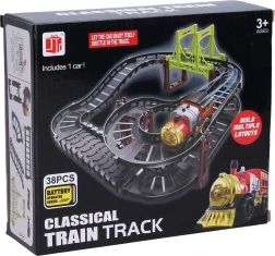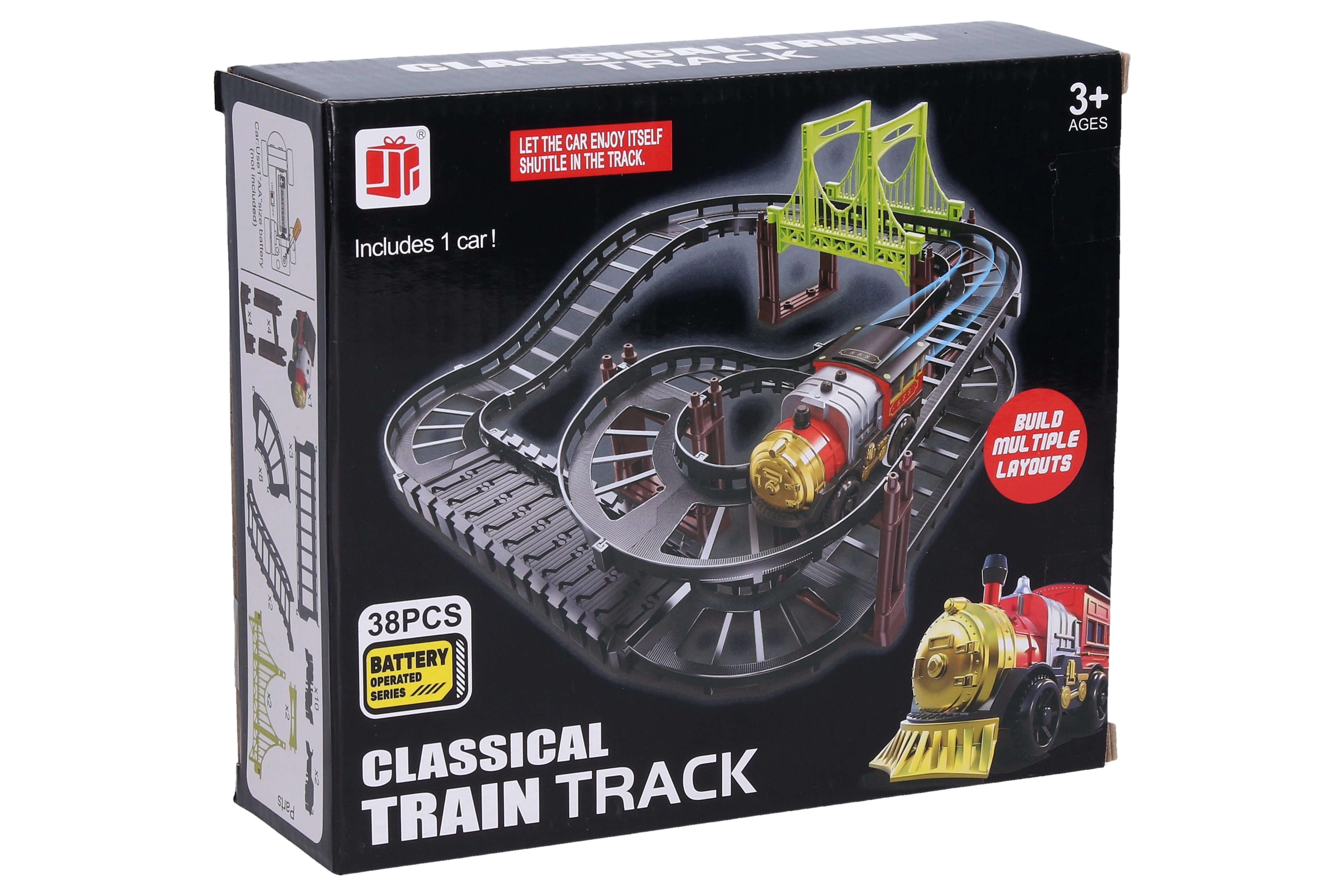 Zum Lieferumfang gehört ein 38-teiliges Set aus Schienen und Zubehör, das Motorik und Fantasie fördert. Eine 1× AA-Batterie (nicht enthalten) sorgt für den Betrieb der Lok. Aufbauhinweise finden Sie direkt auf der Verpackung.