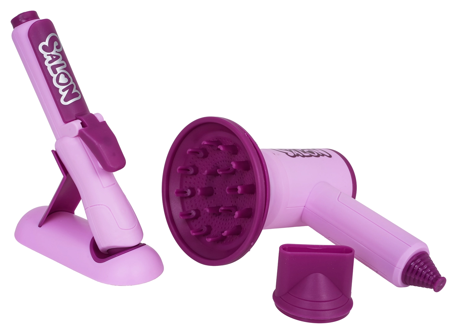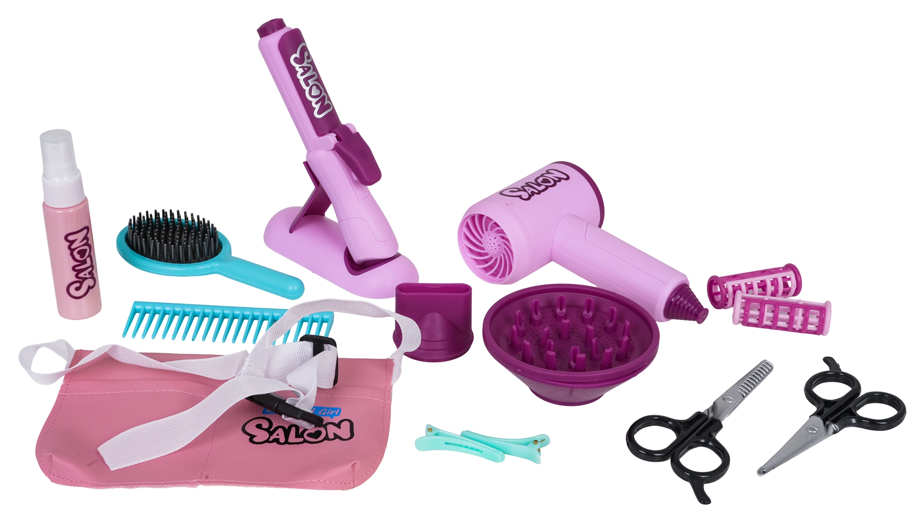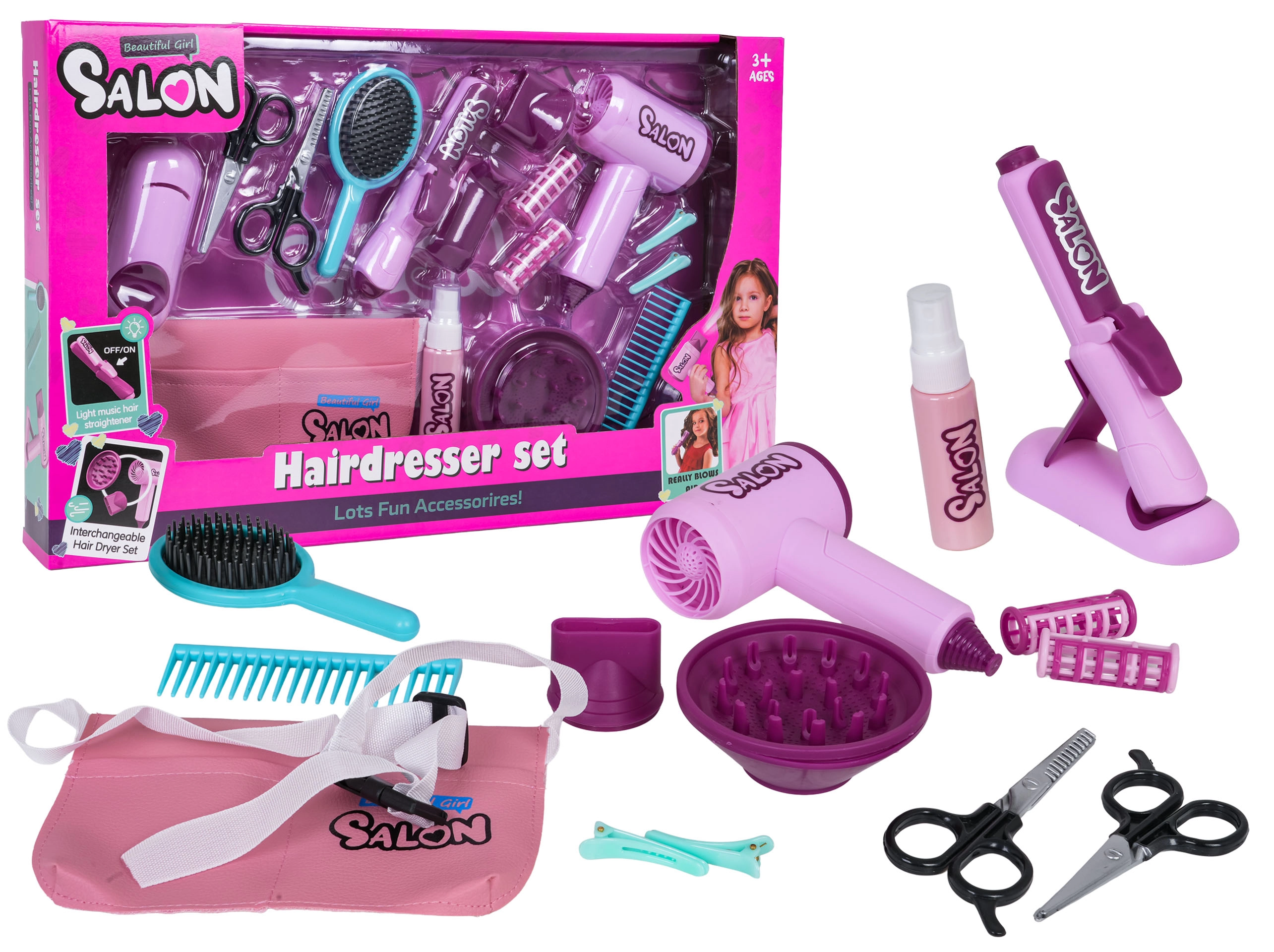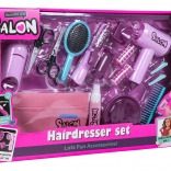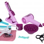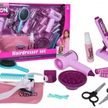 Im Set enthalten ist ein Kinderföhn mit zwei Aufsätzen (Diffusor und Konzentrator), der Föhngeräusch erzeugt und einen sanften Luftstrom bietet – für ein authentisches Erlebnis. Das Kinder-Glätteisen wird mit Knopfzellen betrieben und hat einen Lichteffekt. Ergänzt wird das Set durch Kamm, Bürste, Schere, Effilierschere, Spangen, Lockenwickler sowie ein Fläschchen für „Kosmetik“ – perfekt für kreatives Spiel und die Förderung der Feinmotorik.