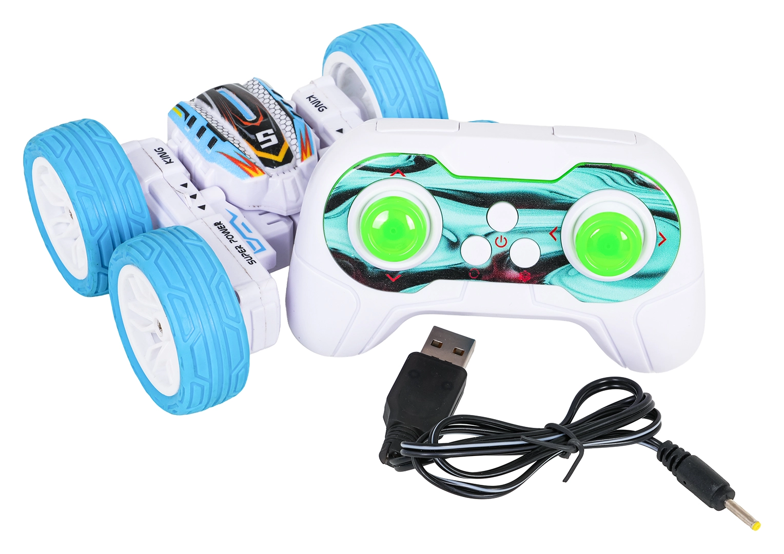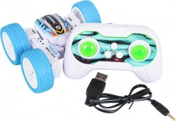 Das RC-Stuntauto POWER STUNT überzeugt durch Agilität und spektakuläre Tricks. Dank der großen Gummiräder bewältigt es Unebenheiten, fährt vorwärts und rückwärts, nach rechts und links, seitwärts und kann sich um 360° drehen. Die beidseitige Bauweise ermöglicht die Weiterfahrt auch nach einem Überschlag. Bunte LED-Lichter sorgen für eine beeindruckende Show.