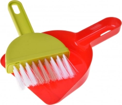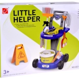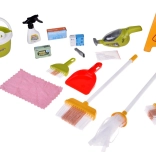 Wischmopp, Besen, Handfeger und Kehrschaufel, Eimer mit Presse, Tuch, Sprühflasche, Warnschild und Schachteln – alles, was Kinder zur Nachahmung von Hausarbeiten brauchen.