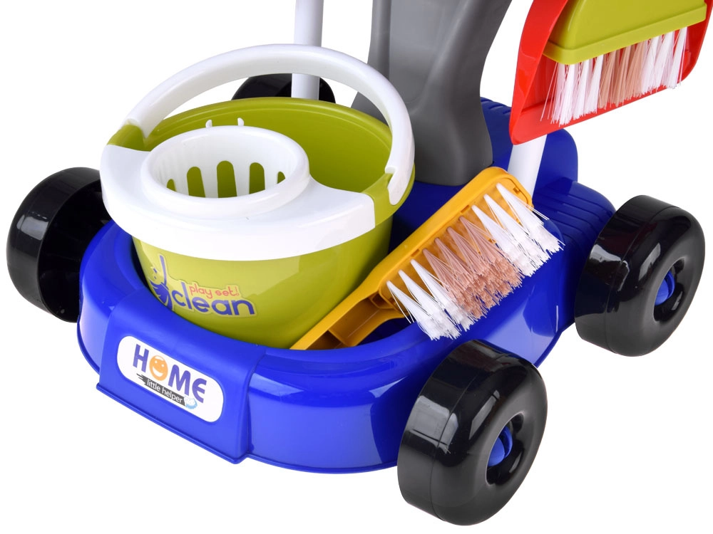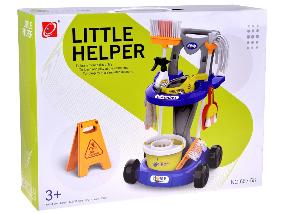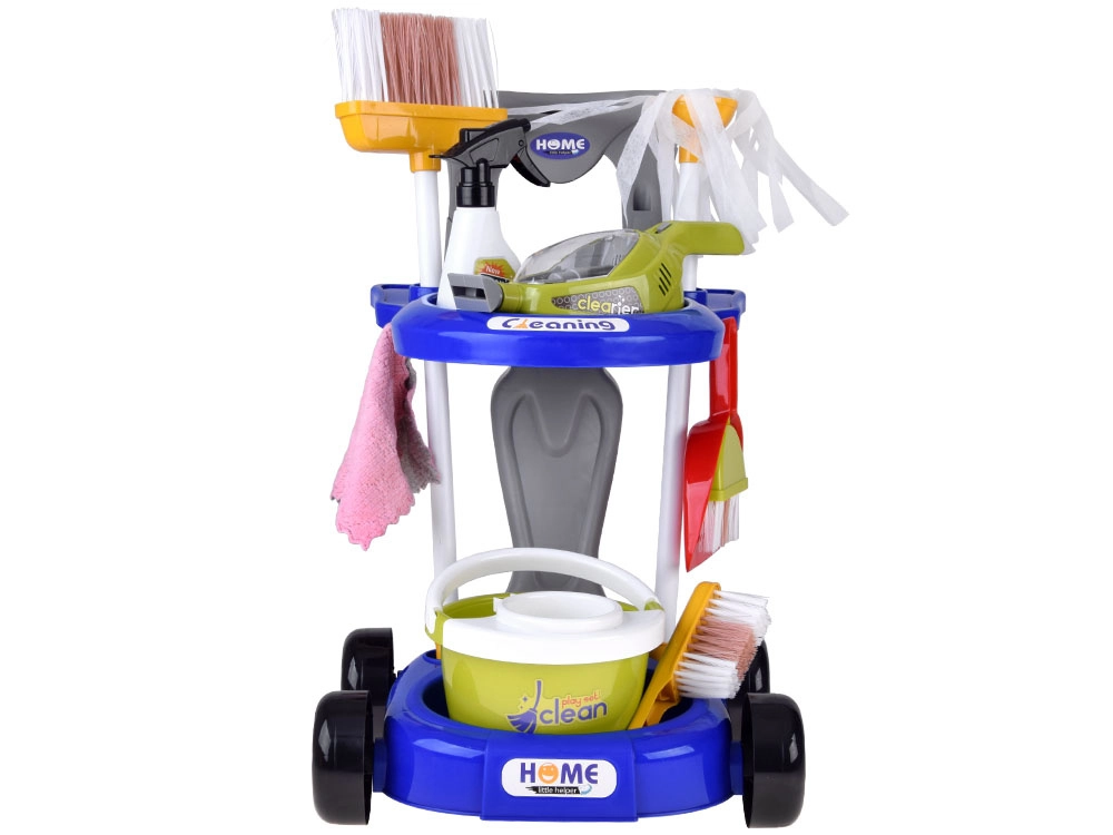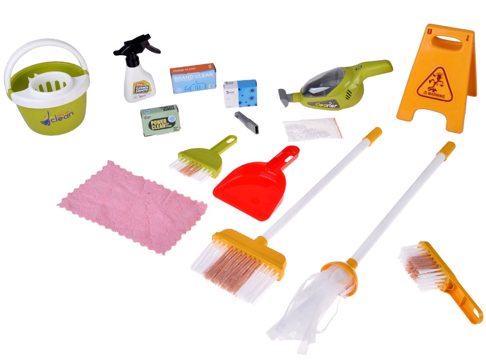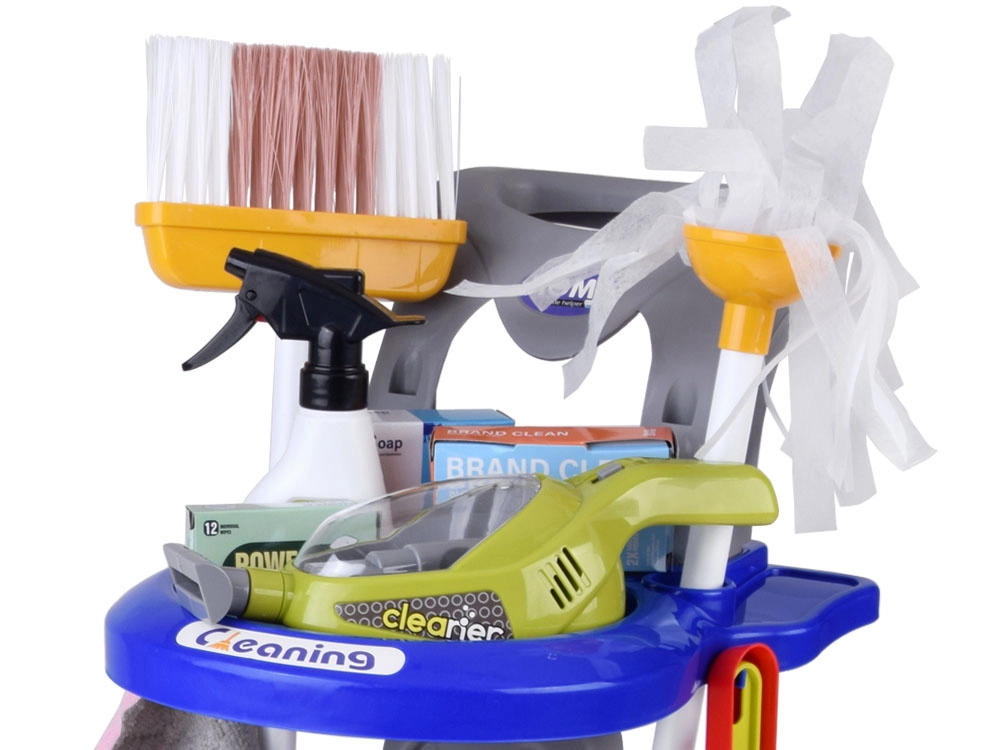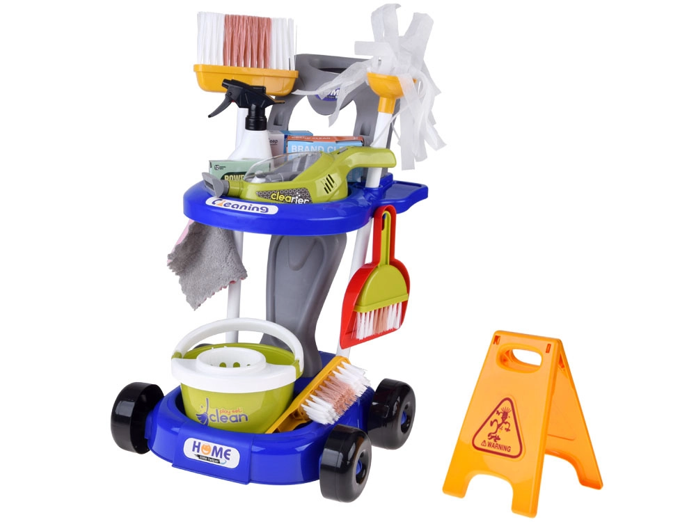 Schenken Sie Kindern realistischen Spielspaß mit einem Putzwagen voller Zubehör. Das Set enthält einen Wischmopp, Besen, Handfeger mit Schaber, Eimer mit Presse, Tuch, Sprühflasche, Warnschild, Kartonschachteln sowie einen Spielzeugstaubsauger mit austauschbaren Aufsätzen und Kügelchen zum „Aufsaugen“. So können Kinder alltägliche Tätigkeiten der Erwachsenen sicher nachahmen und lernen, wie wichtig Ordnung ist.