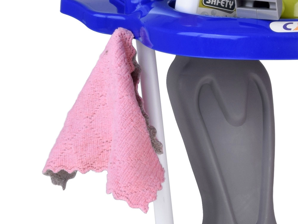 Der Wagen hat kompakte Abmessungen, praktische Halterungen und Haken für Zubehör und lässt sich dank der Räder leicht in jeden Raum fahren. Der Spielzeugstaubsauger ist interaktiv – nach Einlegen von 3× AA-Batterien (nicht enthalten) sammelt er die beiliegenden Kügelchen auf, was die Attraktivität des Spiels erhöht.
