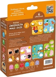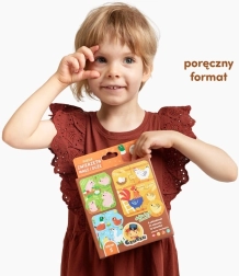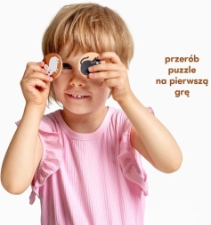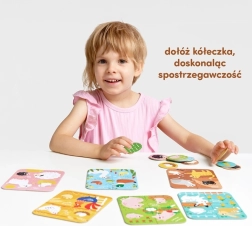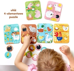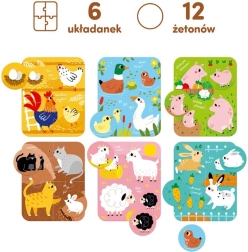 Das Set enthält 6 niedliche vierteilige Bauernhofmotive und 12 zusätzliche runde Jetons – zu jedem Puzzle gehören 2 Jetons. Zuerst setzen die Kinder die Szene zusammen, anschließend ergänzen sie die passenden Ringe an den richtigen Stellen. Bunte Illustrationen laden zum Entdecken ein und helfen, vertraute Tiere zu erkennen.