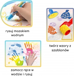 Zum Set gehört umfangreiches Zubehör, das die Spielmöglichkeiten erweitert – von Wasser-Filzstiften und Stempeln bis hin zu einer Musterrolle sowie Schablonen für Buchstaben und Formen. Alles ist leicht, platzsparend und sowohl für zu Hause als auch für unterwegs geeignet.